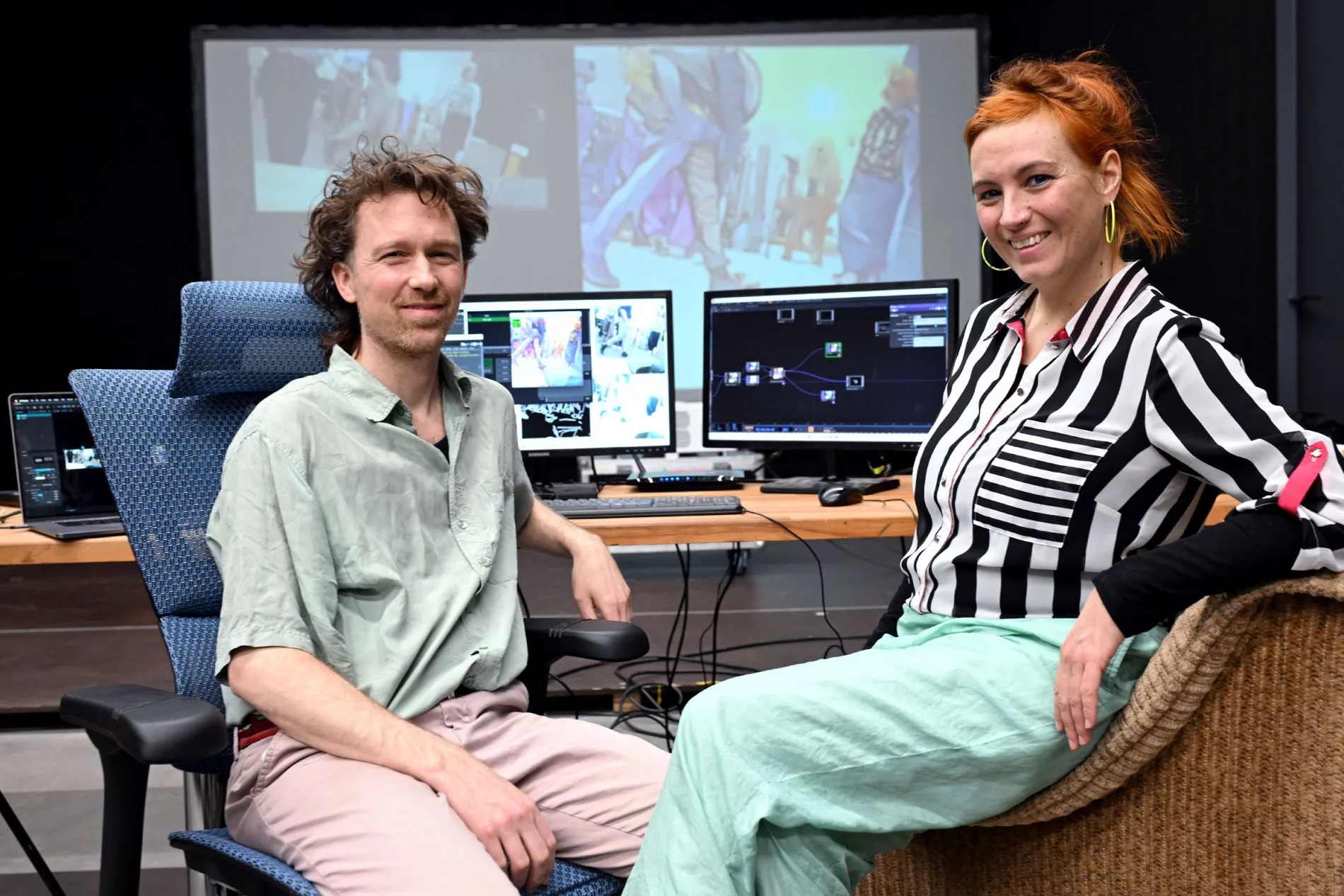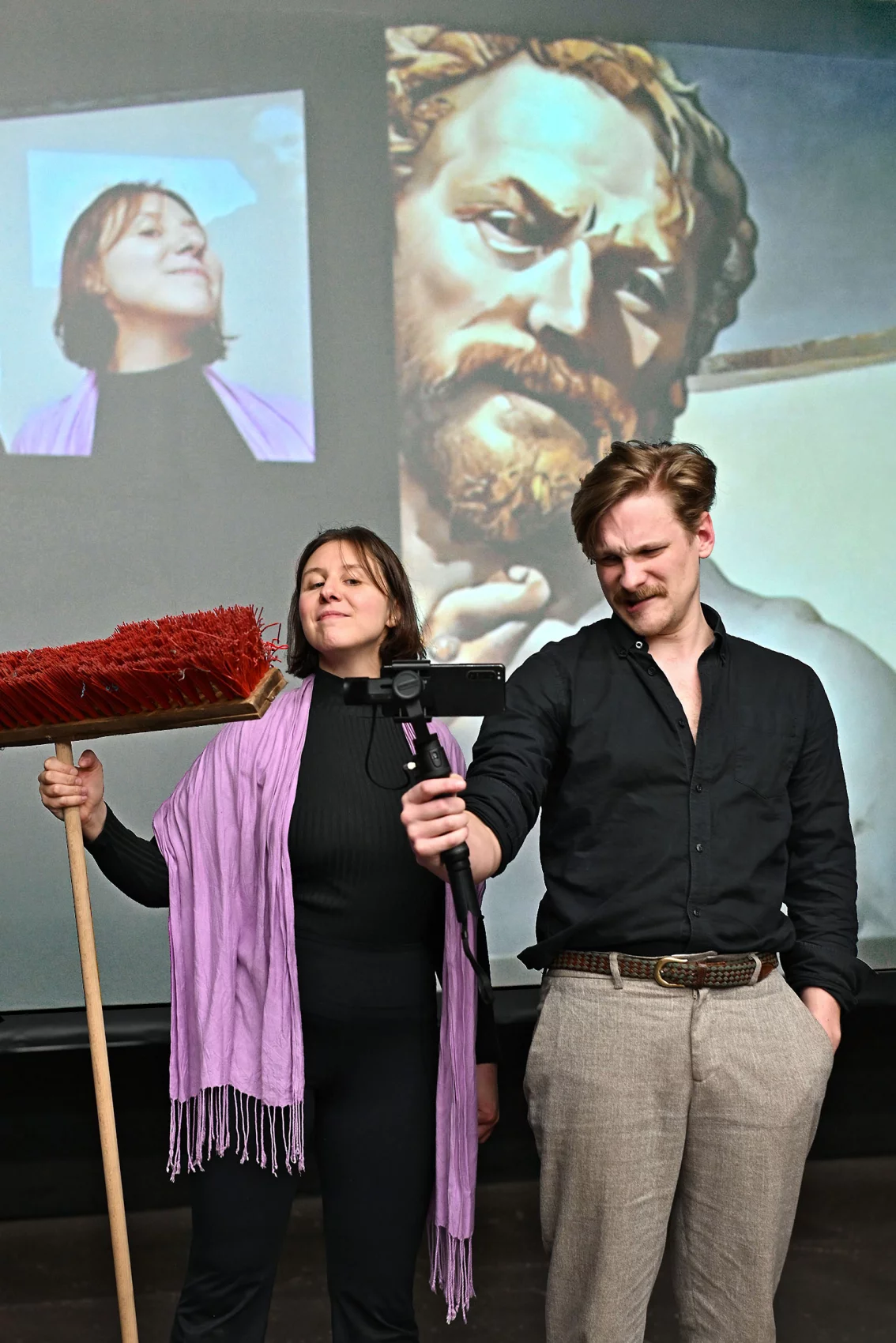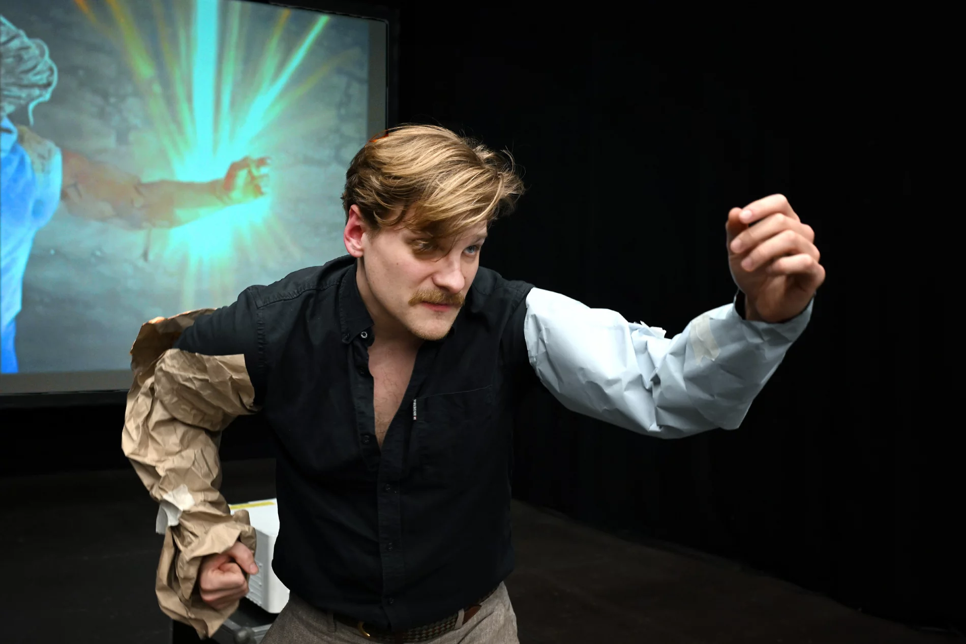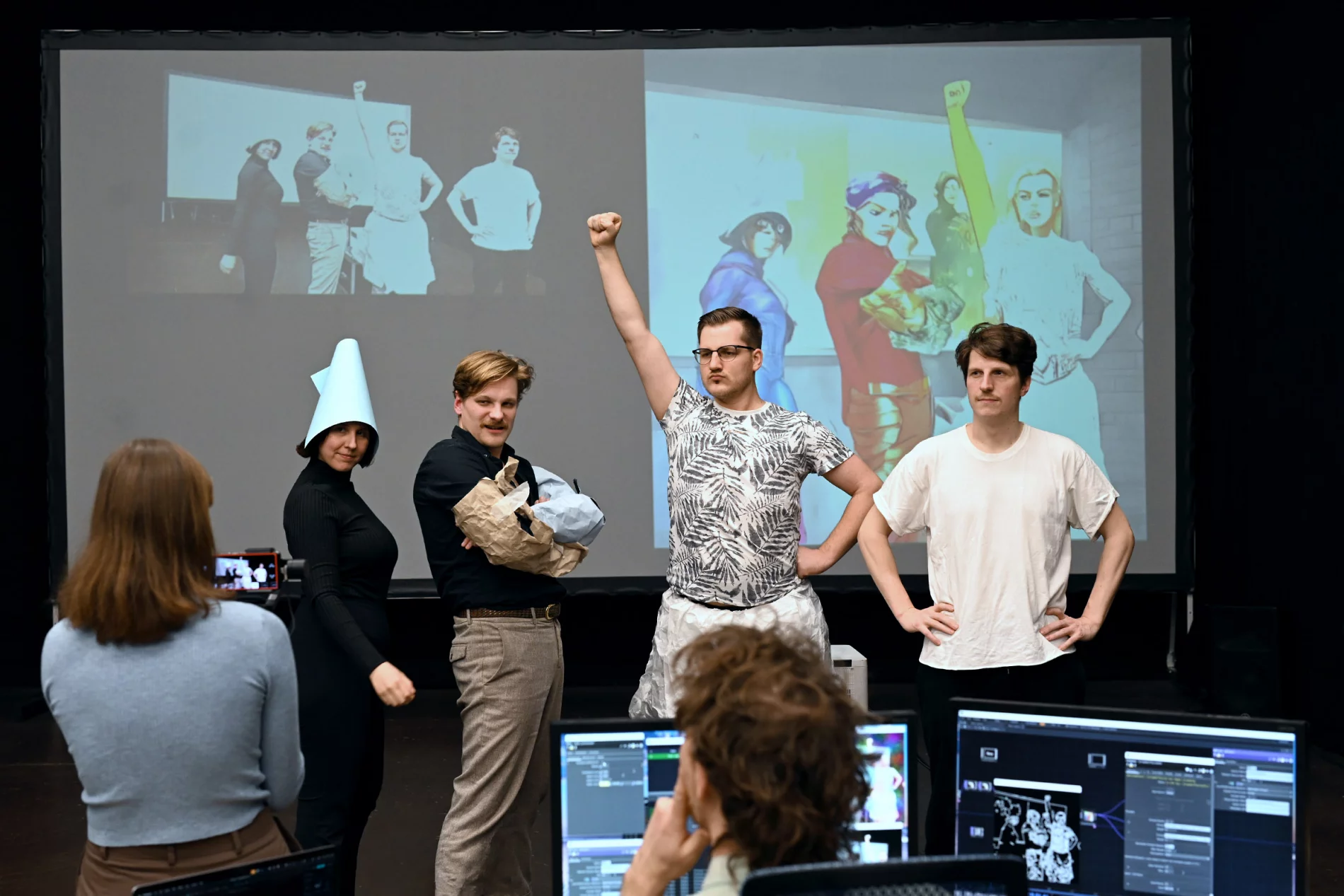 Auf der Bühne verschmelzen reale Räume und Game-Levels: Projektionen, Sounddesign und Live-Action mixen sich zu schnellen, intensiven Szenen. Wir nutzen neueste Technik – inklusive Echtzeit-KI-Videogenerierung. Das heißt: Bilder und Spielwelten werden live erzeugt und reagieren in Echtzeit auf das Spiel der Schauspieler:innen. So werden innere Welten sichtbar und die Grenze zwischen Bildschirm und Bühne verschwimmt vor euren Augen.