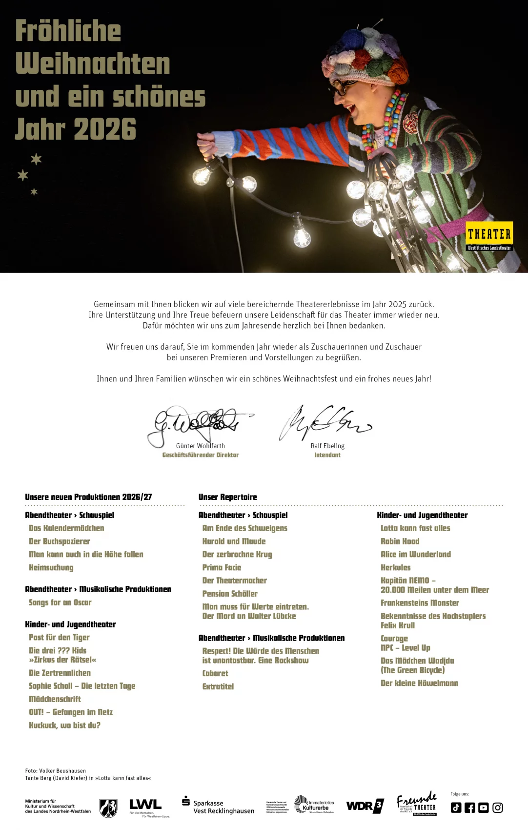 18.12.2025 – Bitte beachten Sie, dass der Kartenvorverkauf und die Verwaltung des Westfälischen Landestheaters vom 24. Dezember 2025 bis zum 1. Januar 2026 geschlossen sind. Am 2. Januar 2026 ist die Theaterkasse von 8 bis 11.30 Uhr wieder vor Ort für Sie erreichbar.