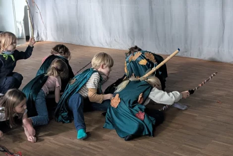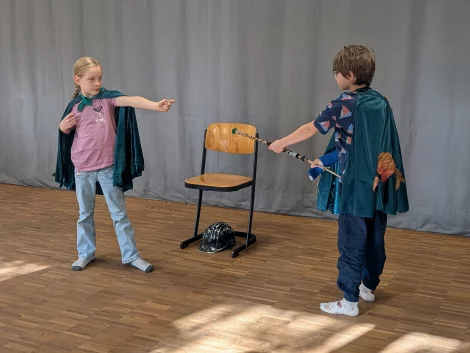 Ein Höhepunkt der Woche war am Donnerstag der Besuch einer Hauptprobe von „Robin Hood“, in der die Kinder die fast fertige Inszenierung komplett anschauen durften. Bevor die Gruppe den Zuschauerraum betreten konnte, informierte Michi Cordes über die wichtigen Regeln im Theater, aber auch darüber, was im Theater erlaubt ist. Dazu gehören nämlich: Lachen, Weinen und Staunen. Nicht erlaubt sind hingegen: Essen, Trinken, Reden und Unpünktlichkeit. Der exklusive Probenbesuch begeisterte die Kinder und brachte die Arbeit im Theater noch ein Stück näher. „Ich fand die Probe toll! Sie haben so gut gespielt und auch witzig“, sagte Leon (8). Und am Freitag hat es Spaß gemacht, unseren Eltern etwas zu zeigen.“ Einige Kinder haben sich den Workshop im WLT ganz gezielt ausgesucht, wie Julius: „Ich stehe gerne im Rampenlicht und habe in der Schule auch schon mal den Weihnachtsmann gespielt“, berichtete der Neunjährige. In der WLT-Inszenierung hinterlässt bei ihm Prinz John einen nachhaltigen Eindruck: „Er lächelt, aber macht dahinter Böses“, sagte er.