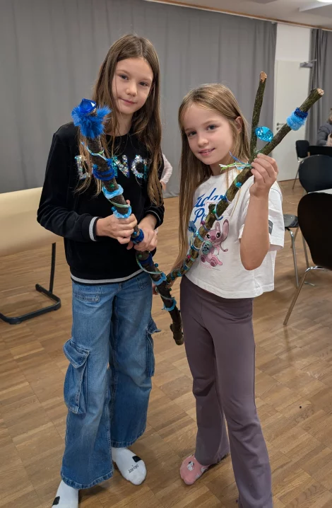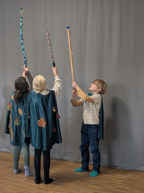 Am ersten Tag standen vor allem verschiedene Spiele zum gegenseitigen Kennenlernen an, wie „Ich packe meinen Koffer – Waldedition“ und „Waldmemory“. Am zweiten Tag begann die große Bastelaktion. Aus einem selbst mitgebrachten Stock, bunten Bändern und Kristallen entstanden Zauberstäbe, die bei den Kindern für Entzücken sorgten. Mit mitgebrachtem Herbstlaub dekorierten sie Umhänge aus dunkelgrünem Pannesamt. „Mir hat besonders gut gefallen, dass wir so viel gebastelt haben und vor allem die Blätter auf den Umhängen“, sagte Frieda anschließend.